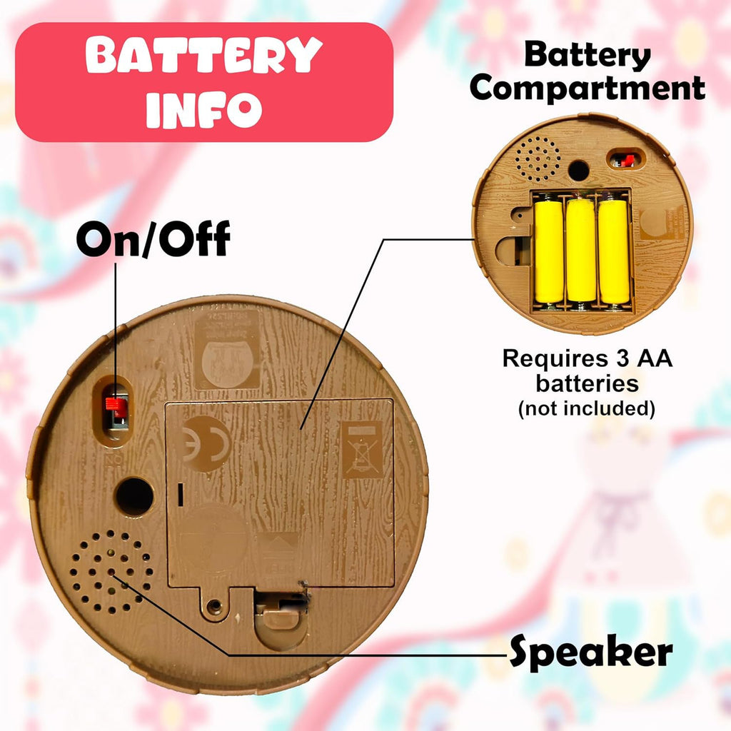 • 【POWER SUPPLY】:- Requires 3 x 'AA' size 1.5V batteries (NOT included). The on/off button is located beneath the toy.